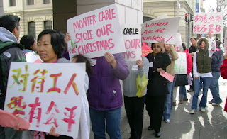 Locally in San Francisco, other local victims of Globalization here are refusing to give in. Some 120 Monster Cable workers are organizing with the support of the Chinese Progressive Association's Workers Organizing Project, San Francisco State students and others to demand economic justice, a fair severance and workers fund to support local workers impacted by corporations' outsourcing, contracting-out and globalization.